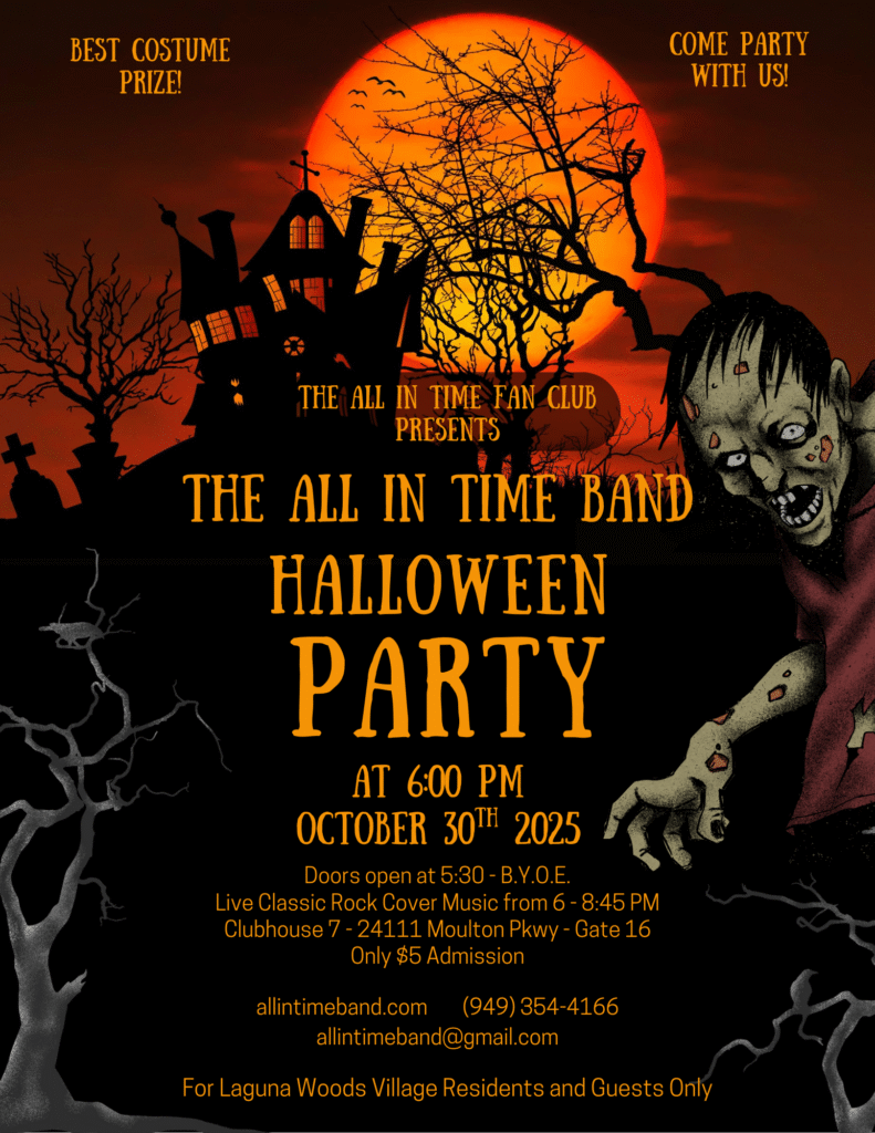 It’s already that time for our annual Halloween Bash – For only $5, you can come and show off your costume and maybe win a prize, but the BEST prize is being able to dance and groove to the Classic Rock Tunes of the All In Time Band! –  Bring your gruel and potions to eat and drink or whatever you want to consume – For Laguna Woods Village residents their and guests only –  Clubhouse 7 – only $5 Admission – Starts at 6:00 Doors open at 5:30 so you WILL be home before the witching hour!